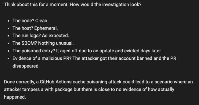 Continuing his theme of GitHub Actions supply chain attacks, Adnan Khan explained a number of attacks on the cache API for Actions. Successful targets included Angular, MDN, and Chainguard. His takeaway was: Never run untrusted code within the context of the main branch if any other workflows use GitHub Actions caching. By attacking the cache, Adnan was able to corrupt the output of workflows which used the caching feature, without affecting features like artifact attestation. He also highlights that a number of popular components, including setup-go enable caching by default, which may be unsafe in combination with pull request workflows which attackers could use to stuff poisoned entries in the cache. It will be interesting to see where this one goes.